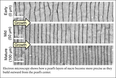 Layers of nacre, the iridescent and extremely durable organic-inorganic composite that also makes up the shells of oysters and other mollusks, build on a shard of aragonite that surrounds an organic center. The layers, which make up more than 90% of a pearl’s volume, become progressively thinner and more closely matched as they build outward from the center.