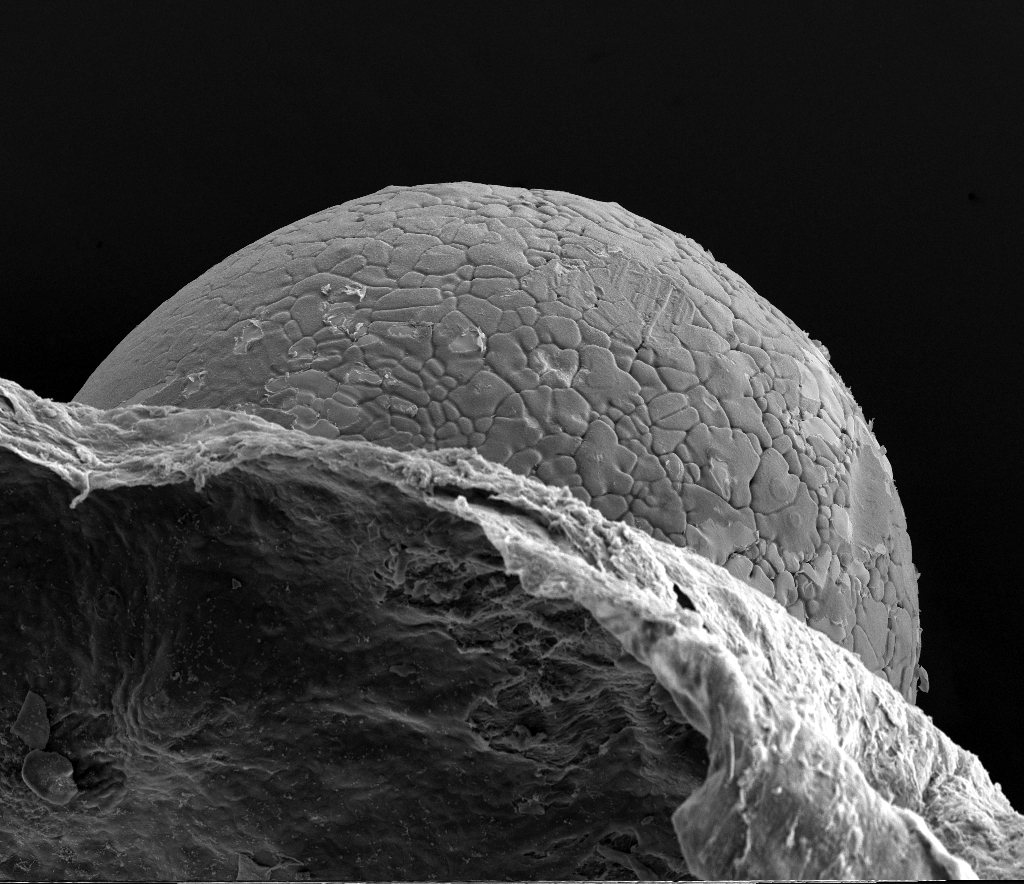 A platinum-iridium cochlear ball electrode was coated with PEDOT-PSS and alginate hydrogel. It was preserved with paraformaldehyde, dried overnight, sputtered with gold, and imaged in the FEI NOVA SEM at 10 kV. The image levels were adjusted with Adobe
