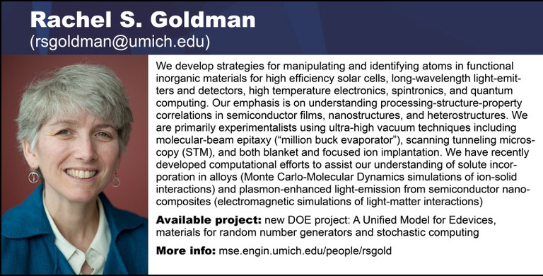We are excited to welcome you all to the Materials Science & Engineering Department at UM! Below you will find a list of faculty who are actively recruiting PhD students this year and we encourage you to take a look at available projects and their group website. Please contact faculty directly via email to discuss projects and meet their lab members.