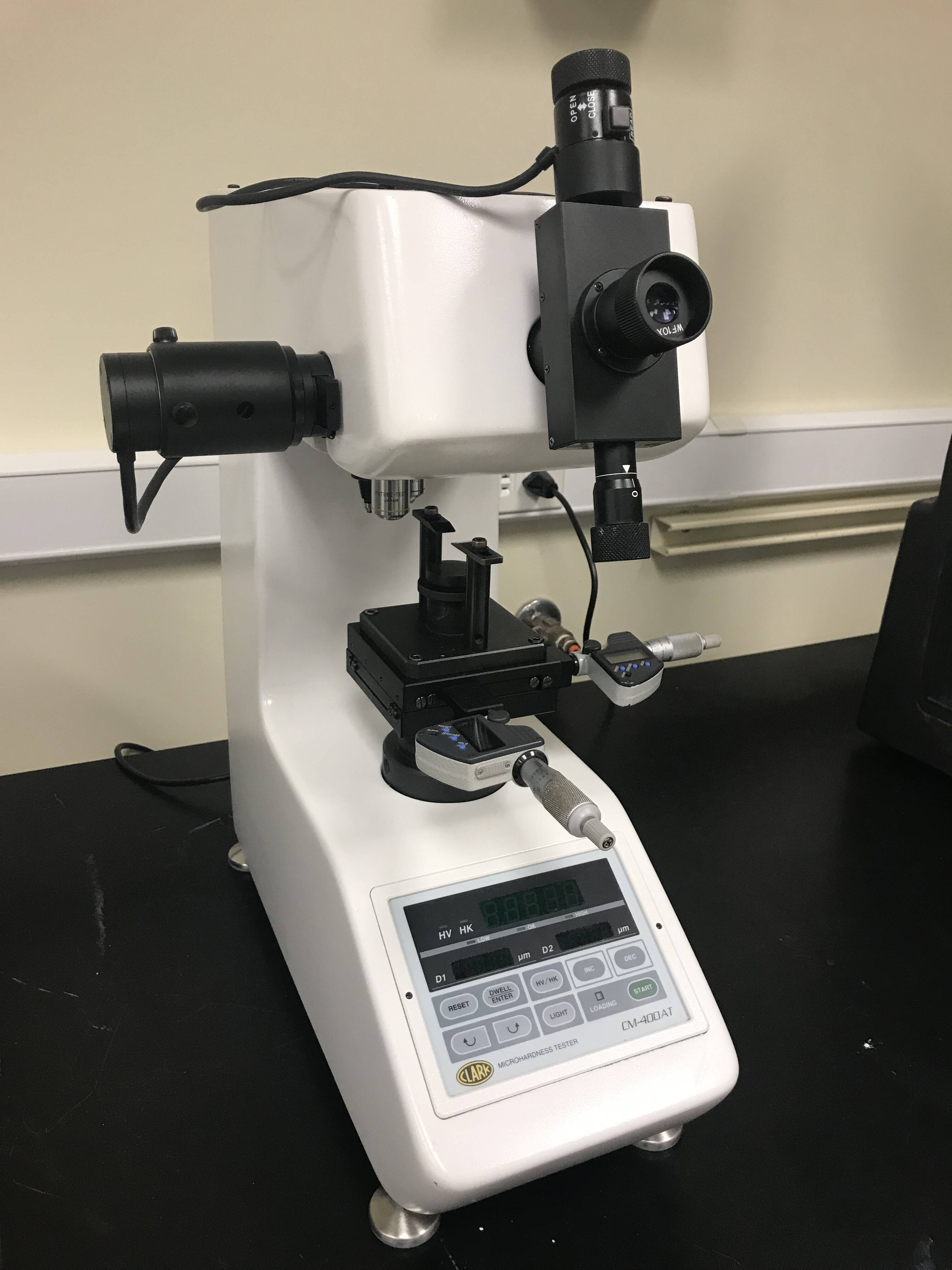 Vickers microhardness tester optimized for mounted/polished specimens but can be used with a variety of flat specimens geometries.  Minimum specimen size approx. 1cm square, maximum approx. 4cm by 10cm.  Applied load can range from 10g to 1kg.