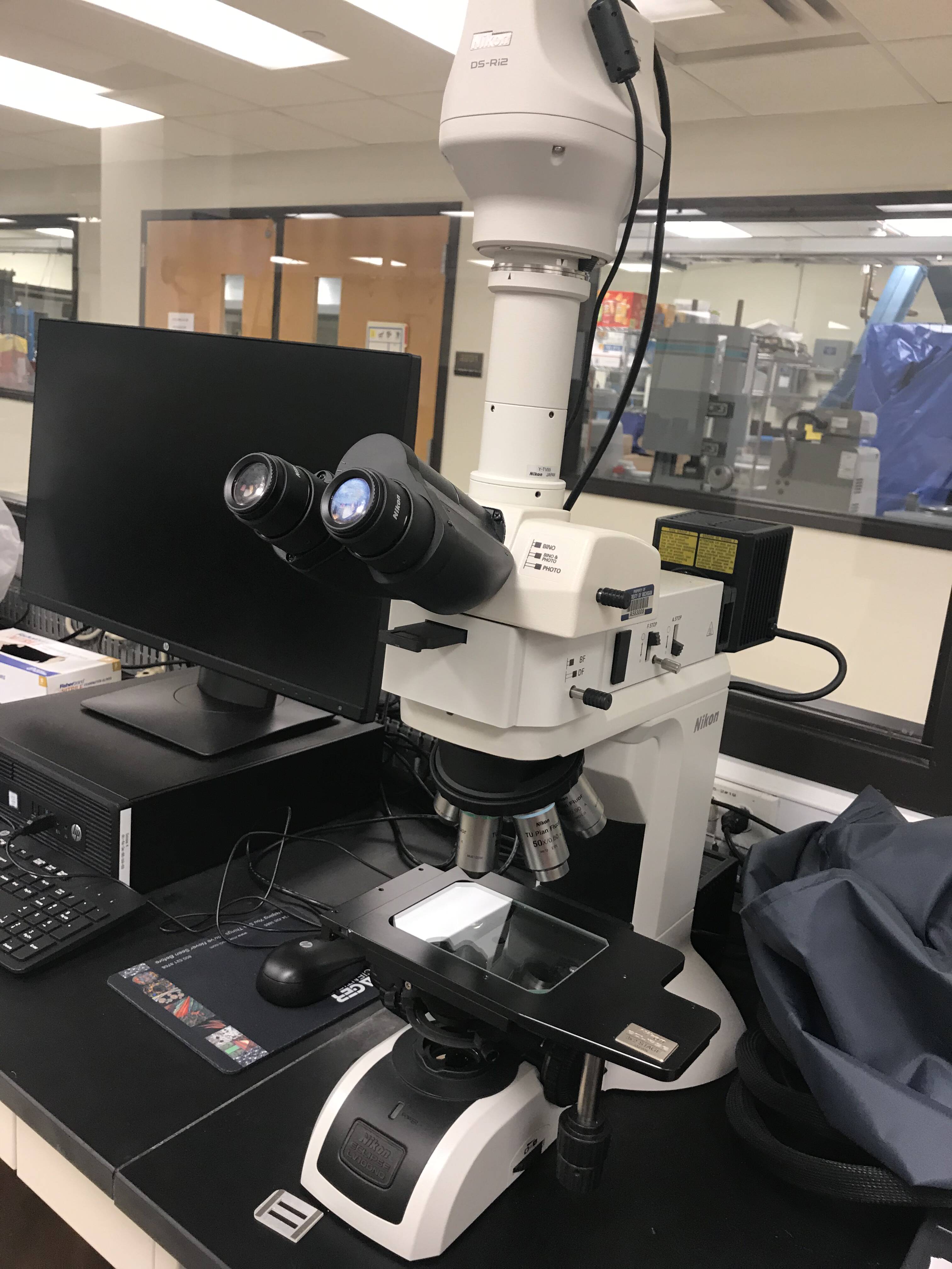 General-purpose upright optical microscopes with brightfield and darkfield illumination modes. Polarizers and prisms for Nomarsky/DIC imaging are available. Objectives range from 5x to 100x and maximum image capture resolution is 16 megapixels. Onboard Nikon Elements software enables image processing tasks including phase measurement, horizontal and vertical image stitching, 3d mapping, and more.