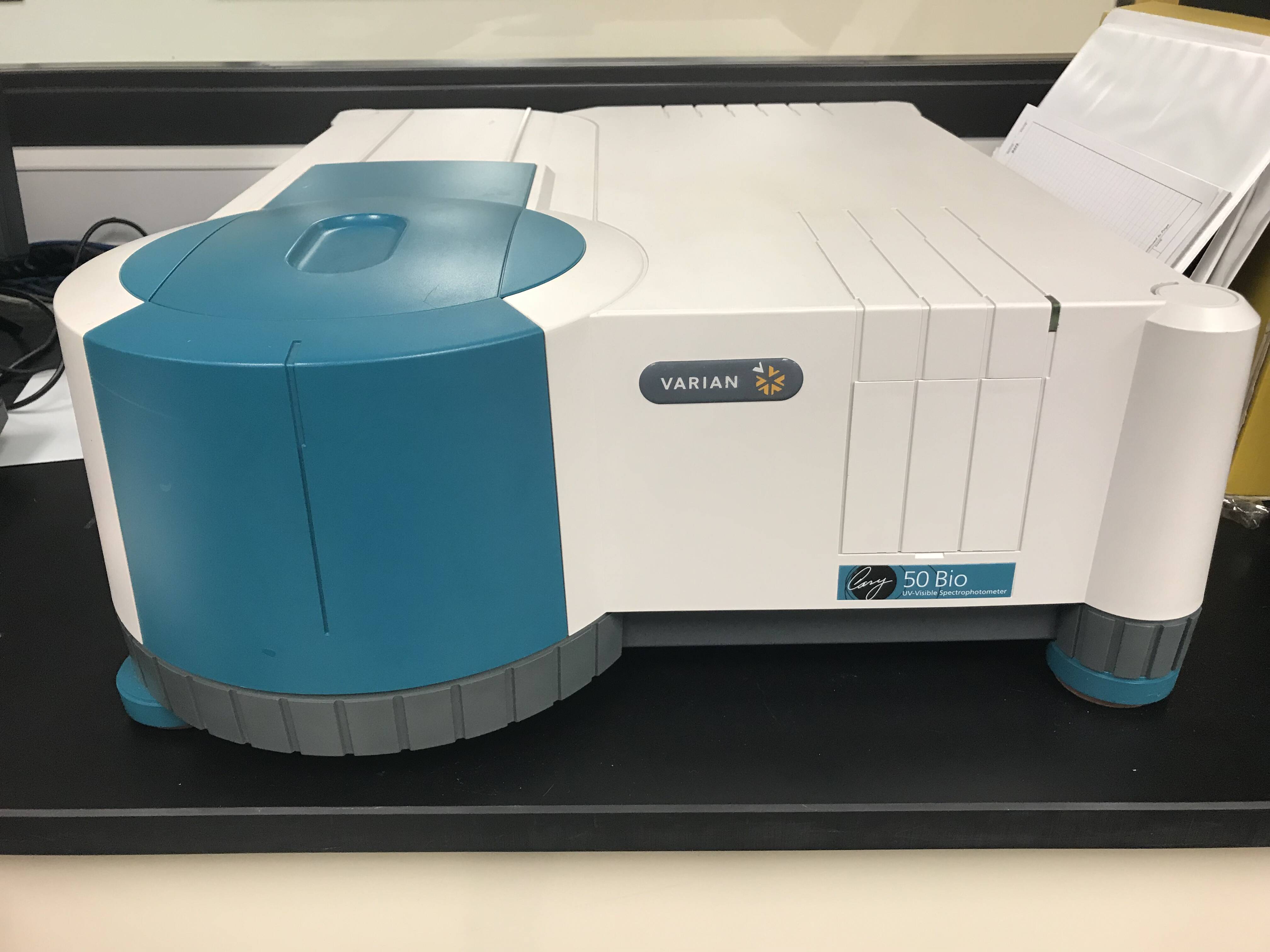 Spectrometer for probing optical transitions within specimens in the visible, near-IR, and near-UV range. Specimens can be solid, powder or liquid and should be translucent as hardware is configured for transmission measurements. Wavelengths range from 190nm to 1100nm.