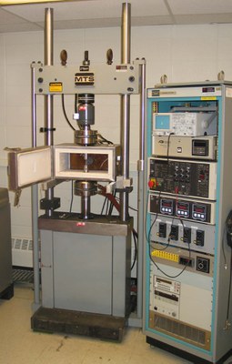 MTS servohydraulic fatigue setupLocation: 1032 GerstackerThis machine is used for conventional fatigue testing at frequencies of ranging from 10-40 Hz. The box furnace shown in the image allows for testing materials at elevated temperatures of up to 250C. |