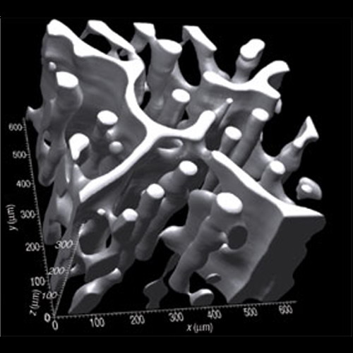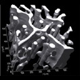 A small portion of the three-dimensional reconstruction of the experimentally measured interfacial morphology after 90 minutes of coarsening is shown. The solid phase is transparent with the liquid regions intersecting the edges of the reconstruction box being capped. The three-dimensional reconstruction was created by accurately stacking serial sections taken from the sample. The microstructure is primarily composed of undulating walls of liquid and liquid tubes.