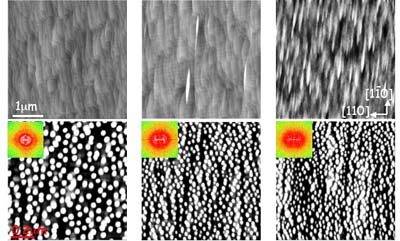 | Recently, strain-induced self-assembled quantum dots (QDs) have enabled the development of high-performance light-emitters and detectors. Further advances in optoelectronics and quantum computing will require a narrowing of the density of states and achievement of periodic charge distributions, both of which necessitate the fabrication of high density, nearly monodispersed, highly ordered QD arrays. Various efforts have been made to achieve laterally ordered InAs/GaAs QDs. However, the mechanisms of lateral ordering of QDs are the subject of continued debate. For example, the formation of QD arrays is generally driven by elastic relaxation of strain; yet, their perfection and stability are often determined by additional processes, such as diffusion and segregation, occurring during growth and/or annealing. In the InAs/GaAs QD system, we have investigated the mechanisms of lateral ordering of stacks of QDs, and propose a new model that relies upon a combination of island nucleation plus subsequent bulk diffusion (ref). An additional remaining question concerns the effects of surface patterning on lateral QD positioning. Therefore, we are presently investigating the roles of modified surfaces in the patterning of QD superlattices. For example, we recently showed that the controlled formation of "mounds" on a GaAs surface may be used to preferentially align QDs along the mound length. This anisotropic QD alignment is explained by a patterning mechanism based upon strain-enhanced In segregation. We are also in the process of exploring the effects of artificial topographical patterns on the growth of QDs, including focused-ion-beam (FIB) patterning, laser-texturing, and patterning using twist-bonded and nanotemplated substrates. In these studies, QDs preferentially nucleate within or near GaAs, resulting in the largest sizes and highest densities of QDs within the dimples, presumably due to an anisotropic surface energy. Our future plans include incorporating QD arrays into a variety of novel devices, including bipolar thermoelectric devices and intermediate-band solar cells. |