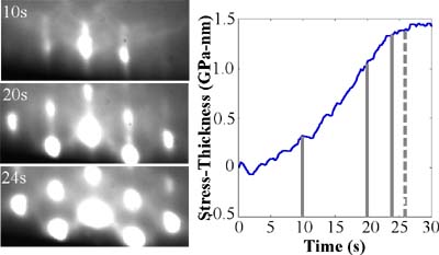 In a multi-beam optical stress sensor (MOSS) system mounted on MBE, the laser diode produces a laser beam as incident beam to the wafer in MBE chamber. An etalon, with a highly reflective dielectric coatings on each side, is placed at an angle to a laser beam. The incident angle of the laser beam leads to multiple internal reflection within the etalon, which generates a linear array of parallel beams. These beams then pass through a second etalon to produce a 2-dimensional array of beams. The number and spacing of these beams can be controlled by the rotation of each etalon. The array of parallel laser beams is then reflected from the sample surface and directly imaged with a CCD camera. The relative changes in spacing of all spots can be simultaneously measured by the CCD camera. These changes of spot spacing can be directly related to stress changes in the film vis Stoney equation. Thus, stress-thickness product can be recorded as a function of time. The figure shows a MOSS measurement of InAs/GaAs growth, with simultaneous RHEED patterns. The Stranski-Krastanov transition occurs at 20s: steak-spotty transition of RHEED patterns, while significant stress relaxation commences at 24s: slope decrease in the plot. This reveals the S-K growth mode transition occurs prior to stress relaxation.