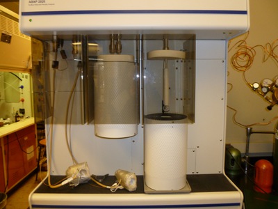 The ASAP 2020 (Accelerated Surface Area and Porosimetry System) performs surface area analyses plus pore size and pore volume distributions, typically using nitrogen as the standard gas.