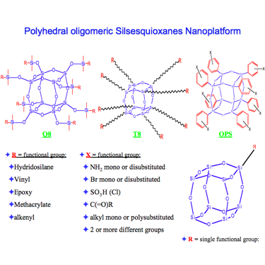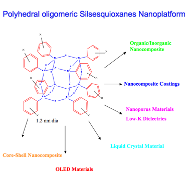 Organic/inorganic hybrid materials represent a new frontier in material chemistry, science, and engineering because they offer the potential to develop and tailor composite materials with control at the finest nanometer length scales. However, the basic problem is that well-defined with diverse functionality are difficult to obtain. Polyhedral oligomeric silsesquioxanes (POSS) offer one solution to this problem in that they provide the opportunity to design materials with extremely well-defined dimensions and behavior.